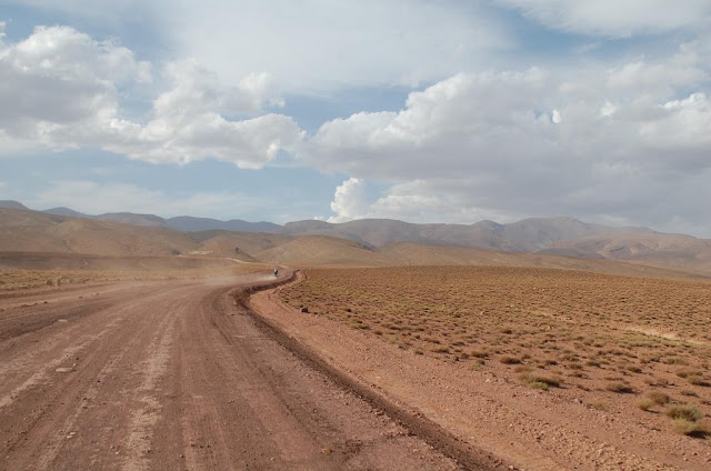 Während Sebastian sich noch geräuschvoll müht, seine Seitenkoffer in die ursprüngliche Form zu versetzen, sitzen wir anderen über der Routenplanung für morgen. Wir nehmen uns eine etwas längere Transitetappe vor, um dann Übermorgen den Tizi-N-Test Pass erreichen zu können. Nach dem Essen gibt es statt angekündigter heisser nur eine realexistierende kalte Dusche. Danach falle ich schlapp auf die Matratze, und während im Tal der Muezzin zum Abendgebet ruft, schlafe ich sofort ein.